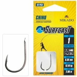 De Mikado Surfcast Snelled Chinu Hooks zijn onderlijnen die speciaal zijn ontworpen voor het strandvissen. De haken hebben een brede bocht, wat zorgt voor het goed haken van de vis. De lengte van de onderlijn is 2 meter. De haken zijn op een speciale chemische manier scherp gemaakt. De verpakking bevat 10 kant en klare onderlijnen. De onderlijnen zijn geschikt voor het strandvissen, aangeraden door de Spaanse vissers!